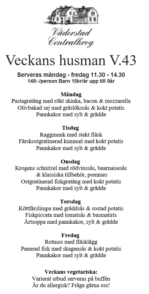På Väderstad Centralkrog serverar vi hemlagad mat från grunden och med mycket kärlek. Här vill vi att våra gäster ska trivas och känna sig som hemma samtidigt som man avnjuter vår goda mat.